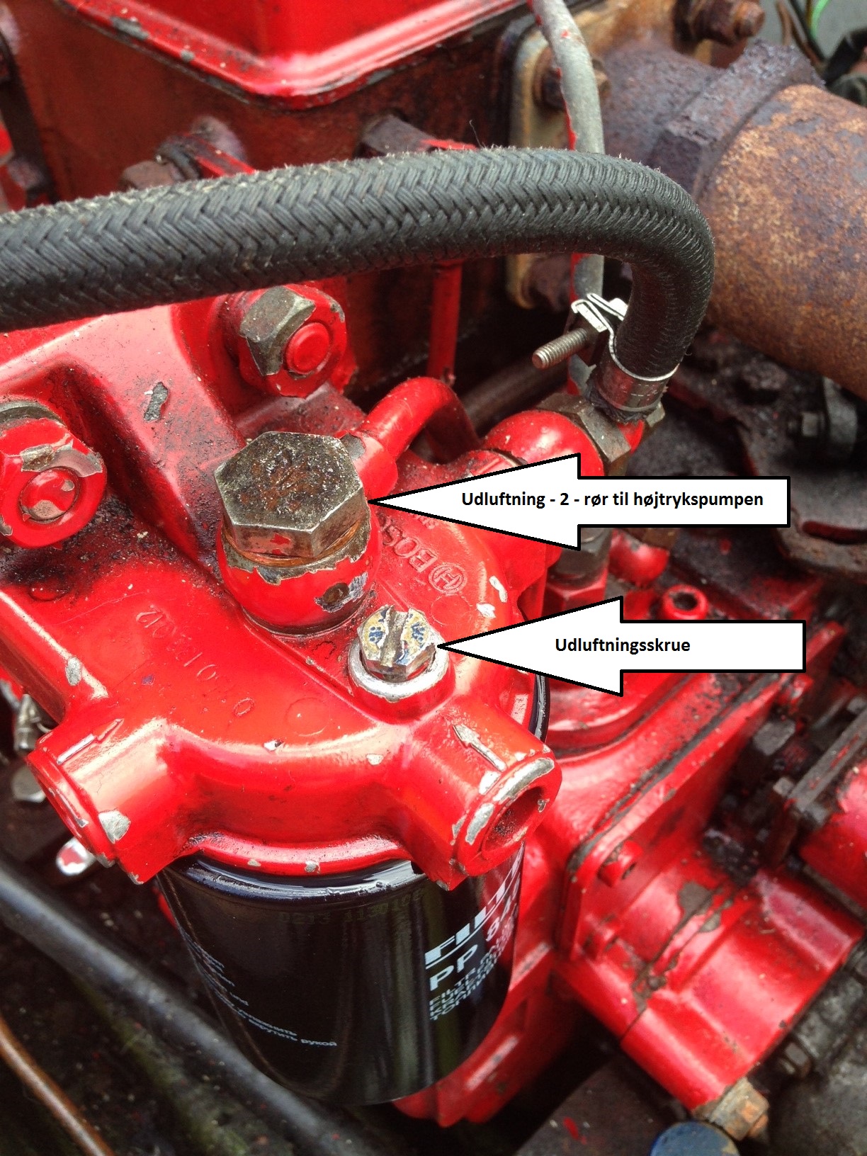 Løsn udluftningsskruen på dieselfilteret (se billede nedenfor) og begynd at håndpumpe forpumpen - på denne måde udluftes luft fra dieselfilteren - Pump indtil der kommer diesel ud af udluftningsskruen og der ikke kommer mere luft.