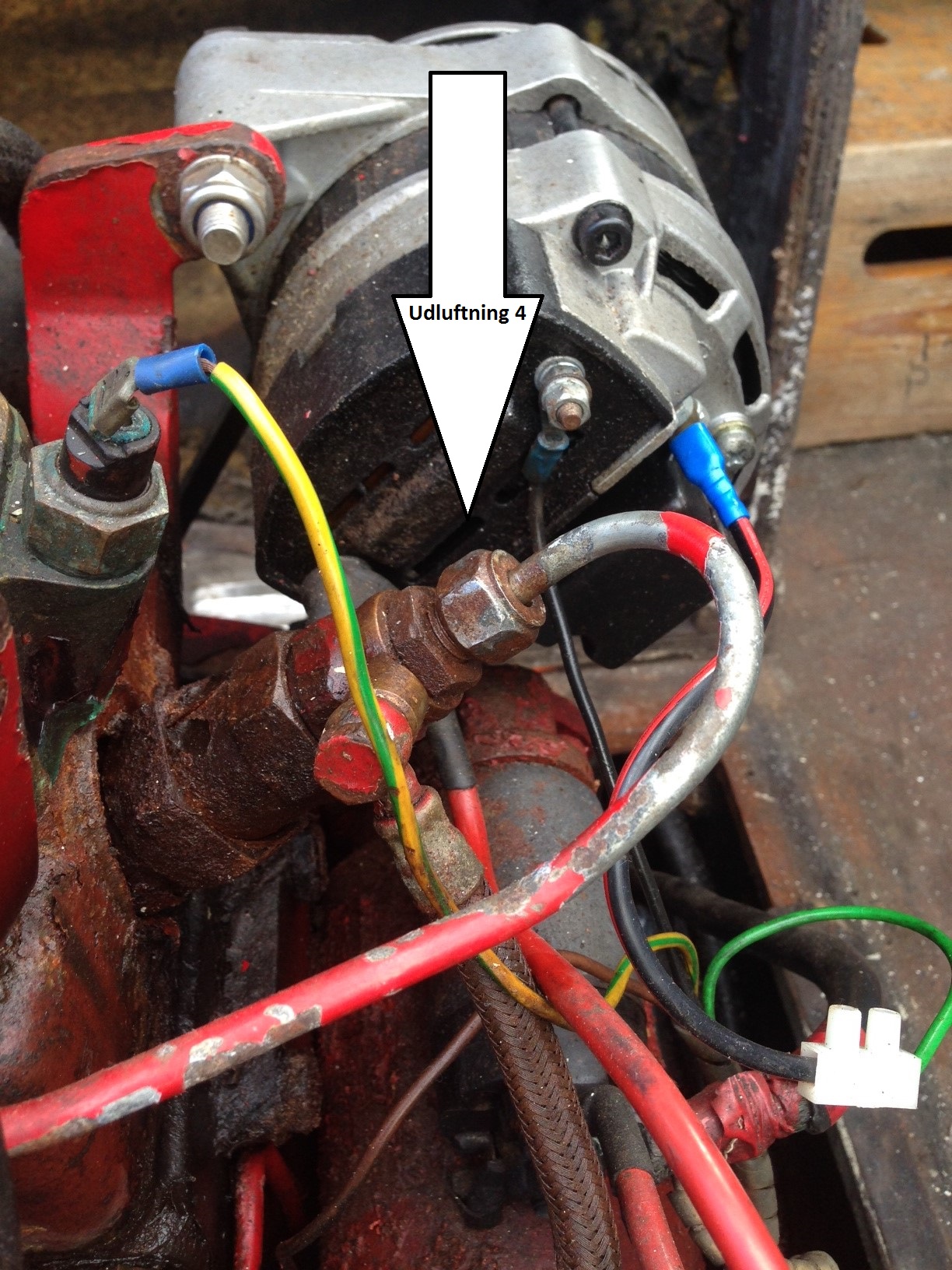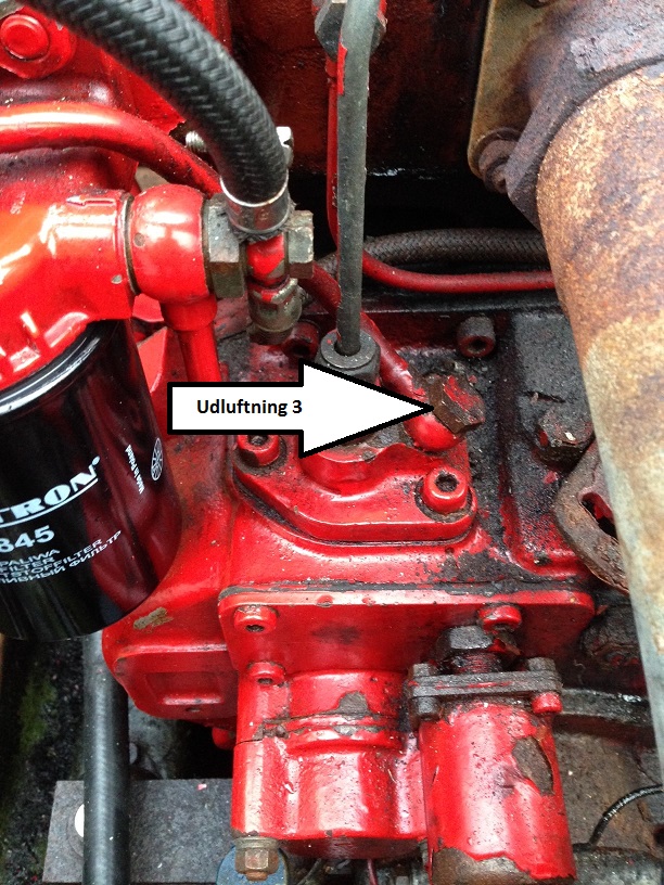 Løsn røret ved brændstof dyssen (udluftning 4 - se billede nedenfor) og tørn motoren - enten med håndsving eller ved at benytte starteren. Når der kommer diesel ud ved udluftning 4 spændes røret til igen.